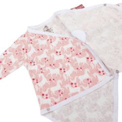 - Partea interioara a bodyului, care vine în contact cu pielea copilului este alba și plăcută la atingere. Exteriorul bodyului, datorita tehnicii de imprimare a materialului, este putin mai ferm.