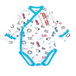 - Partea interioara a bodyului, care vine în contact cu pielea copilului este alba și plăcută la atingere. Exteriorul bodyului, datorita tehnicii de imprimare a materialului, este putin mai ferm.