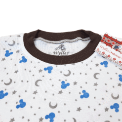 - Imprimeul pijamalelor ilustreaza autobuze semiluni gri si capuri Mickey albastre, potrivit baietilor.