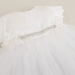 - Sistemul de inchidere este efectuat cu ajutorul unu fermoar ascuns, care se deschide pana sub talie, facand imbracarea copilului foarte usor de realizat.Lungimea rochiei este medie, sub genunchi, putant fi purtata pana copilul mai crestesi ea devine mini.