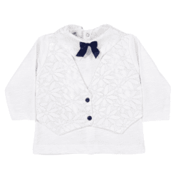 Cămășuța este realizată din bumbac 100%, subtire și moale, de culoare albă.